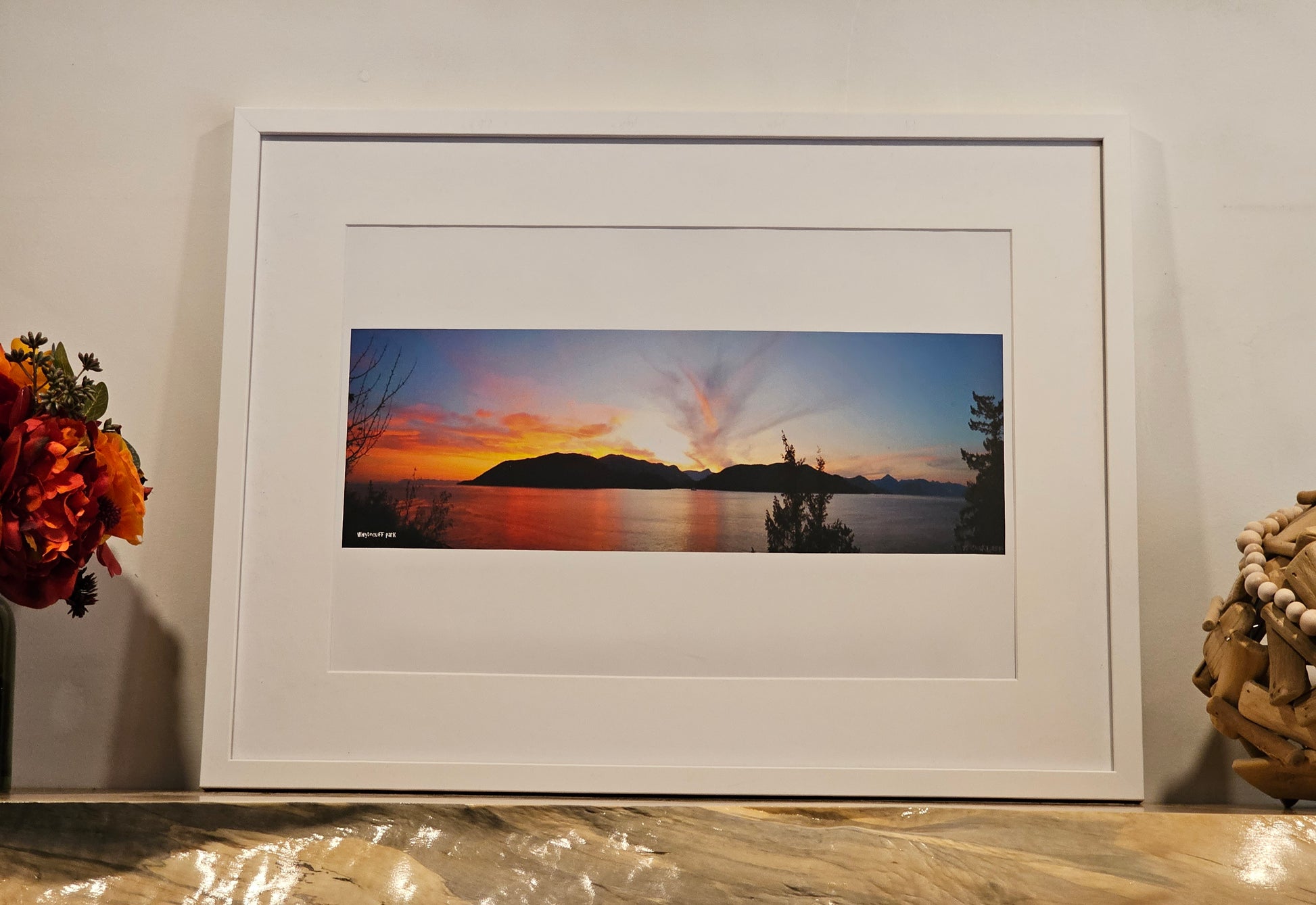 Print is 13" x 19" and is matted and framed in a 19" x 25" gallery quality white wood frame.